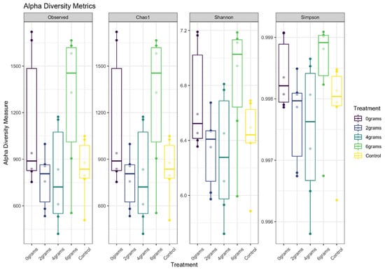 Alpha diversity metrics of bacterial richness and evenness of ruminal bacterial communities among treatments in Angus cattle described by Observed, Chao1, Shannon, and Simpson indexes.