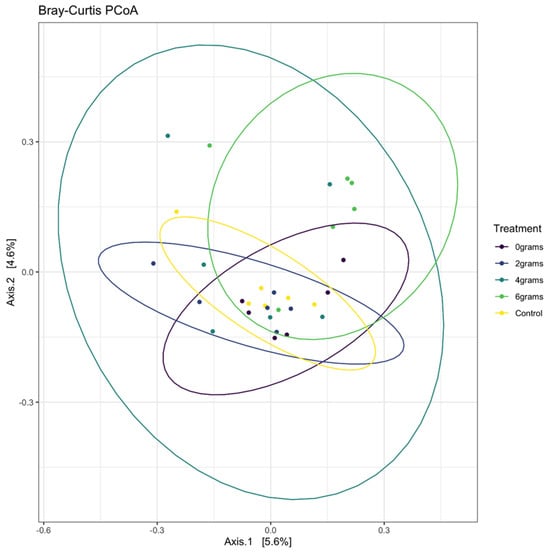 Bray–Curtis PCoA grouped by dose treatment in Angus cattle. Points and ellipses of the same color represent taxa within treatment groups. Clustering indicates similarities of taxa among treatment groups.