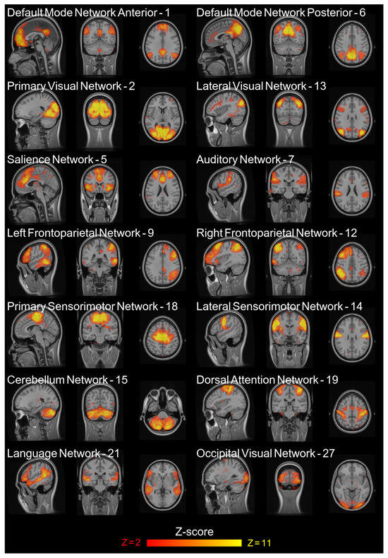 - Damoiseaux, J.S.; Rombouts, S.A.; Barkhof, F.; Scheltens, P.; Stam, C.J.; Smith, S.M.; Beckmann, C.F. Consistent resting-state networks across healthy subjects. Proc. Natl. Acad. Sci. USA 2006, 103, 13848–13853. [Google Scholar] [CrossRef]