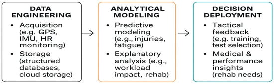 This three-stage framework in Figure 1 illustrates the flow from raw sensor data to actionable outputs. The first block, data engineering, encompasses acquisition, storage, and preprocessing activities that prepare data for analysis. The second stage, analytical modeling, transforms processed data into predictive or explanatory outputs. The final stage, decision deployment, translates model results into practical insights delivered through tactical, medical, or performance systems.
