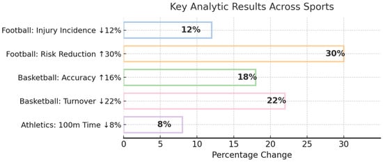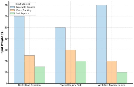 The distribution of the relative weighting of data sources used in analytical models is presented in Figure 2. It highlights the significant importance of inertial sensors for tactical decision-making in basketball (60%), while in football, GPS/NIRS sensors carry the highest weight (50%), reflecting the critical role of physiological metrics in injury prevention.