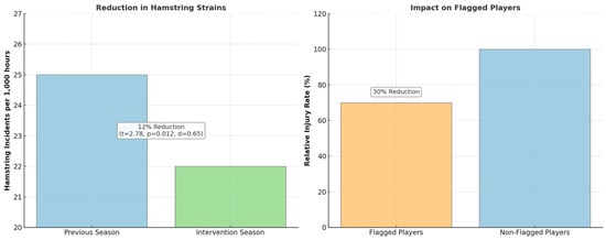 Additionally, we obtained a small retrospective dataset (n = 50 footballers) that included tracked PlayerLoad™ and injury labels to validate the synthetic dataset. We compared the means and variances of key features, confirming the realism of the synthetic data. Specifically, mean PlayerLoad was 3.2 ± 0.8 (synthetic) compared to 3.3 ± 0.7 (real), and the hamstring-strain incidence was 9% in the real dataset versus 10% in the synthetic dataset (one-sided t-test, p = 0.24) [44].