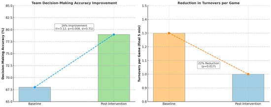 Tactical Decision Engine for In-Game Optimization (Basketball)—The basketball case study required a model capable of real-time tactical recommendations. For this, we implemented a Markov Decision Process (MDP)-based Tactical Decision Engine, where game states were defined by features such as score differential, time remaining, player fatigue indicators, and opponent formation. The rationale for selecting an MDP over alternative methods lies in its ability to model sequential decisions under uncertainty, which is critical in real-time tactical contexts such as basketball [57,58]. This is consistent with its established role in dynamic programming and policy optimization under temporal constraints. While simpler models such as logistic regression or rule-based systems can capture isolated decision features, they are inherently limited in representing state transitions and temporal dependencies across plays [55,56]. In contrast, the MDP framework enables the modeling of evolving game states and long-term reward optimization, making it more suitable for capturing the dynamic, high-pressure nature of tactical basketball decisions. The model evaluated possible actions (e.g., substitution, timeout, and set play) based on a reward function calibrated to expected point differential or win probability. The optimal policy was learned using Deep Q-Networks (DQN), a reinforcement learning algorithm well-suited for decision-making under uncertainty [59]. Policy outputs were evaluated in simulated match scenarios to assess consistency and robustness. For real-time implementation, the system computed expected-value differentials (EVD) between tactical options and provided alerts when a player’s predicted probability of executing an optimal decision fell below a defined threshold. This engine enabled in-game interventions, such as substitutions or timeout calls, based on integrated biomechanical fatigue indicators and strategic context. DQNs were selected due to their ability to approximate complex value functions in large or continuous state spaces, which was necessary given the multidimensional nature of the tactical state representations [59]. Alternative reinforcement learning methods such as State–Action–Reward–State–Action (SARSA) or actor–critic models were considered [60], but DQN provided a suitable balance between training stability, policy performance, and implementation simplicity within the scope of this proof-of-concept simulation.