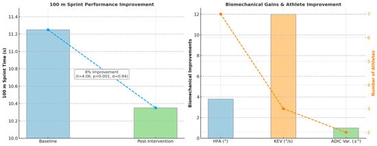 Performance Prediction Network for Biomechanical Optimization (Athletics)—To forecast sprint performance improvements based on biomechanical input data, we developed a feedforward multilayer perceptron (MLP) model trained on extracted kinematic features from high-speed video and pose estimation [61,62,63]. Inputs to the model included hip flexion angle at toe-off (HFA), knee extension velocity (KEV), and ankle dorsiflexion at initial contact (ADIC)—biomechanical variables known to influence sprint efficiency [64,65]. The MLP architecture consisted of two hidden layers with Rectified Linear Unit (ReLU) activation functions, dropout regularization to prevent overfitting, and was optimized using the Adam optimizer (implemented in TensorFlow, Google LLC, Mountain View, CA, USA) [66,67] with mean squared error (MSE) loss. A validation set was used for early stopping to ensure generalization [68]. Model performance was assessed using mean absolute error (MAE) and root mean squared error (RMSE) following best-practice recommendations [68]. The outputs informed athlete-specific technical prescriptions, including mobility drills and strength exercises, making the model central to personalized sprint mechanics optimization [61,64,65]. Although multilayer perceptrons or ensemble regressors offered higher predictive accuracy [66,67], linear regression was additionally employed for interpretability and transparent coefficient-based insights. This complementary approach allowed for direct quantification of individual biomechanical features influencing sprint performance, essential for designing athlete-specific interventions [64,65].