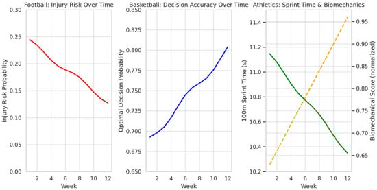 - Time-Stamp and Sequence Construction: For football and basketball scenarios, we generated time-stamped sequences for each event at 1-Hz resolution during training sessions (lasting 90 min each) and at 10 Hz during match simulations. For athletics, joint-angle streams were initially generated at 1000 Hz (simulating high-speed camera data), then downsampled to 100 Hz with Kalman smoothing applied prior to analytical modeling [40].