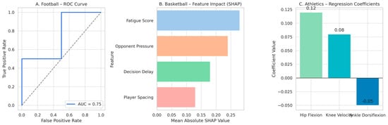 Training Procedure—The training procedure for each model followed standard supervised learning protocols, designed to ensure both analytical rigor and comparability across case studies [68]. Each predictive model was trained on its corresponding synthetic dataset using validated machine learning strategies [66]. For classification tasks (e.g., injury risk prediction in football), we employed stratified 5-fold cross-validation to maintain class balance and minimize overfitting, a common best practice in sports analytics involving imbalanced datasets [69,70]. For regression-based tasks (e.g., sprint performance optimization), a 60/20/20 train–validation–test split was used, with early stopping criteria applied during training to enhance generalization [66,67]. Model-specific hyperparameters were optimized using grid search techniques, and performance was evaluated through appropriate metrics such as Area Under the Receiver Operating Characteristic Curve (AUC-ROC) (for classifiers), mean absolute error (MAE), and root mean square error (RMSE) for continuous outputs, following standard machine learning evaluation protocols [68]. LightGBM models were trained as gradient boosting classifiers for binary prediction tasks [57], logistic regression was used for decision-making estimation, and multivariate linear regression supported biomechanical performance forecasting. Interpretability was ensured through SHAP value analysis for tree-based models [5] and standardized regression coefficients for linear models, a common approach for transparent model interpretation [71]. This end-to-end training pipeline was implemented consistently across all scenarios and served as the basis for subsequent validation and expert review procedures described in Section 3.5.