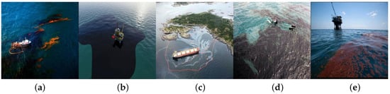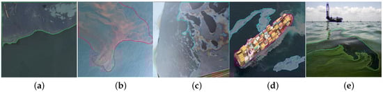 LADOS Illustration of representative images and their classes: (a) “Oil”, “Emulsion”, and “Ship” [], (b) “Oil” and “Oil-platform” [], (c) “Sheen” and “Oil” [], (d) “Oil”, “Sheen”, and “Ship” [], and (e) “Emulsion” and “Oil-platform” []. The “Background” class is present in all images.