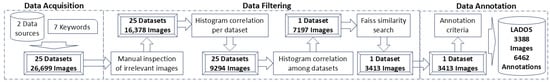 The initial step in generating LADOS is the collection of the potential image samples from online sources. Following the methodology proposed by [], we have explored the recommended sources (Kaggle5, Roboflow6, V7 Labs7 and Google Datasets8) in addition to GitHub9. From the visual exploration of the datasets’ images, two sources were selected (Roboflow and GitHub) as they include the most relevant image samples to the LADOS dataset objectives. Considering the aforementioned sources, we utilized a list of keywords to gather the candidate datasets and, therefore, their images. These keywords were selected after review of SotA methods with a particular focus on aerial imagery approaches, and include “oil spill”, “emulsion”, “ship”, “sheen”, “oil spillage”, “ocean oil pollution”, and “marine pollution”. Taking into account the chosen online sources and the selected keywords, 26,699 images were collected from 25 datasets (Figure 2—Data Acquisition) [,,,,,,,,,,,,,,,,,,,,,,,,,], providing a comprehensive collection of aerial imagery samples for the LADOS dataset.