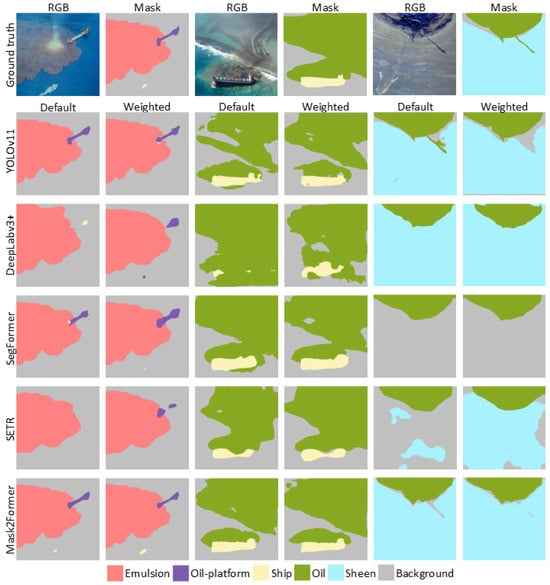 Figure 4 illustrates a comprehensive visualization of the models’ performance in three representative dataset samples. In the first row of Figure 4, the RGB image is showcased along with its ground truth segmentation masks. In the next rows, the predicted masks for each model, followed by the corresponding default and weighted losses, are depicted. From a detailed examination of the results in first, third, and fifth columns, it is clearly illustrated the effective prediction of semantic masks using SegFormer and Mask2Former models, compared to the rest, except YOLOv11, that efficiently predicts the instance masks of the included objects (i.e., ships). In addition, a detailed examination of the predicted masks generated by each model trained with the default and the weighted losses (columns 1st–2nd, 3rd–4th, and 5th–6th) proves the effectiveness of the class weights for tackling the imbalanced classes issue. Specifically, highlights are depicted using: DeepLabv3+ in the first and second samples, SegFormer in the second sample, and Mask2Former in the first sample. Overall, the semantic segmentation approaches outperform the instance segmentation one, with the SegFormer and Mask2Former reporting higher performance trained both with default and weighted losses, with the SegFormer performing better on liquid classes, and the Mask2Former overall.
