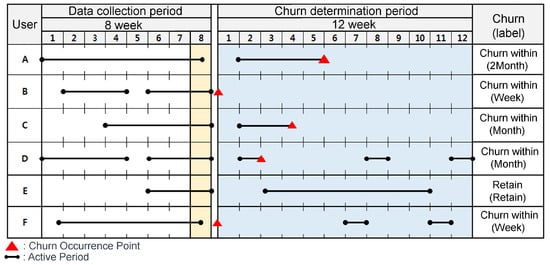 User activity during the 8-week observation and 12-week churn determination period. The red triangle indicates the Churn Occurrence Point, the last active week before four weeks of inactivity. (Source: NCSoft, Seoul, Republic of Korea).