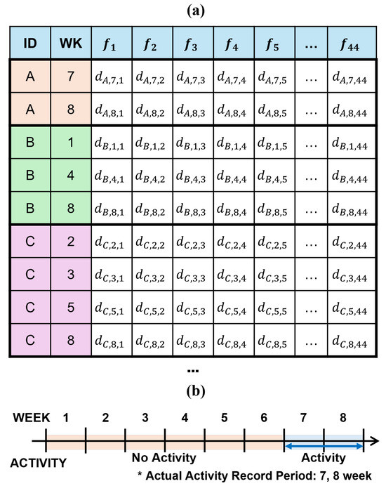 (a) Panel data format showing weekly (WK) activities for each user ID. (b) Interpretation of User A’s activity recorded during week 7–8.