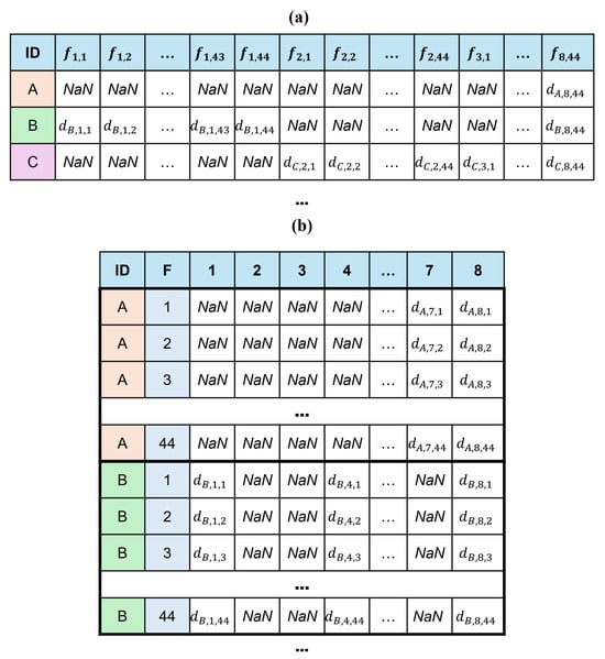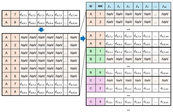 The dataset used in this study is structured as panel data, recording the weekly average activity for each unique user ID. Each user has one row per week of data, with user IDs linking observations across time, as shown in Figure 2. Here, ID represents a unique user identifier, f denotes features, and d represents recorded data values. Due to varied engagement patterns, users have different numbers of active weeks. To standardize the input for machine learning, each user’s timeline is padded to 8 weeks using NaN (not a number) values for inactive weeks, as shown in Figure 3.