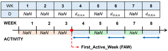 In this study, we analyze user inactivity (NaN), their timing, and potential causes to improve the accuracy of churn predictions. To do so, we define First_Active_Week (FAW) as the first week a user shows activity. NaN values occurring before FAW may indicate a new or dormant user (N/D) or temporary absence. At the same time, NaNs after FAW may suggest either decreased interest (DI) or external factors (EFs), such as travel or technical issues. Figure 4 illustrates an example timeline, and Table 5 shows the distribution of NaNs across users by FAW. The table reveals that many data points exhibit NaN values, indicating that a significant portion of users may experience intermittent periods of inactivity.