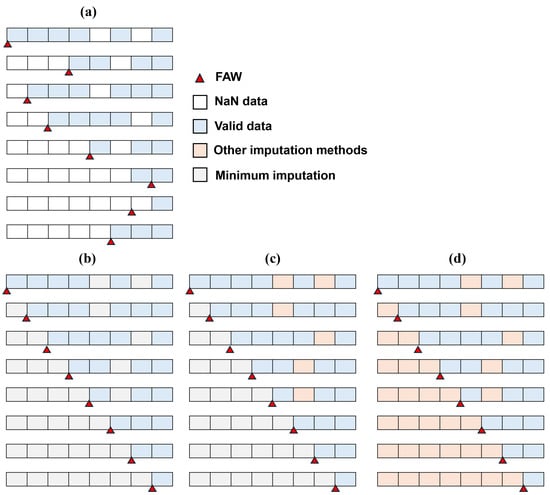 We distinguish between non-existent data (from DI or N/D) and missing at random (MAR) data (from EF). The former is imputed using minimum values; the latter is estimated using imputation methods. Table 6 outlines the three assumptions we adopt when imputing NaN values, based on whether they occur before or after the user’s FAW.