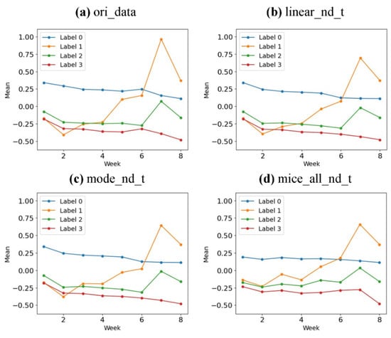 - Temporal Consistency: We also examined whether imputation preserved weekly activity patterns by comparing the original dataset against three imputed datasets: linear_nd_t, mode_nd_t, and mice_all_n_td. Figure 7 shows average play_time and payment_amount trends by churn label across 8 weeks. For example, Label 1’s spike in week 7 and Label 3’s consistently low values are preserved across all imputed versions. These results confirm that key temporal dynamics remained intact after imputation, further supporting the validity of the datasets for modeling.