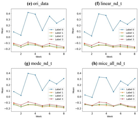 Figure 7. Comparison of weekly average user activity by label: original data (ori_data) vs. three imputation methods (linear_nd_t, mode_nd_t, mice_all_n_td). Shown are averages for play_time (a–d) and payment_amount (e–h) across four churn labels.