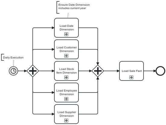 Figure 1 represents a conceptual model example, demonstrating the main populating processes associated with the load of the star schema. The process reveals the need to first populate the dimension tables (and the independence of tasks through parallel gateways) and then the fact table (preserving referential integrity).