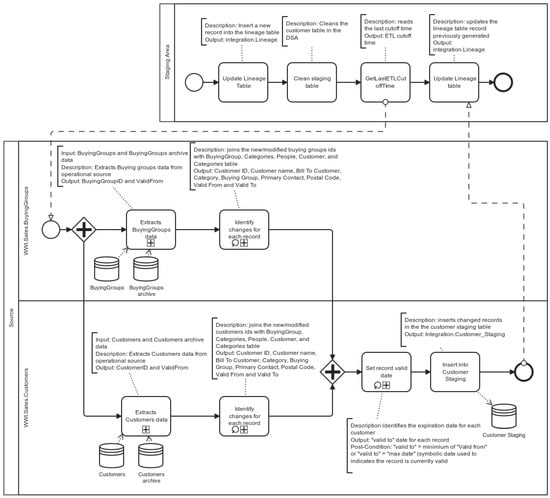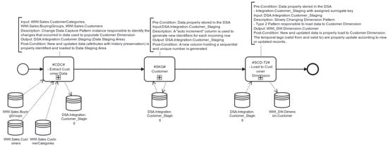 The third level (task level) represents the elementary level for ETL and is presented in Figure 3. The process details the #SCD-T2#—“Load to Customer Dimension” subprocess from Figure 2. The layer employs BPMN collaboration diagrams to represent interactions between distinct entities, such as source systems and staging areas, using pools and message flows to denote synchronized partnerships. Complex operations can be abstracted into subprocesses, enabling modular drill-downs without cluttering the high-level view. Data stores explicitly depict repositories such as lineage tables and staging areas, with directional arrows clarifying input–output relationships. Structured annotations accompany each task, detailing pre-conditions for execution, input sources, output targets, and post-conditions to validate success. Loop markers indicate record-level processing, which iterates over individual customer records. Pools are included only when critical to understanding partner interactions, such as distinguishing source systems from staging areas, while intermediate events like error handling are omitted to prioritize clarity. These guidelines collectively ensure the model remains accessible to stakeholders while encoding the technical rigor required for implementation, facilitating validation and reuse across ETL workflows. This work does not address physical primitives to enable the translation to ETL tools.
