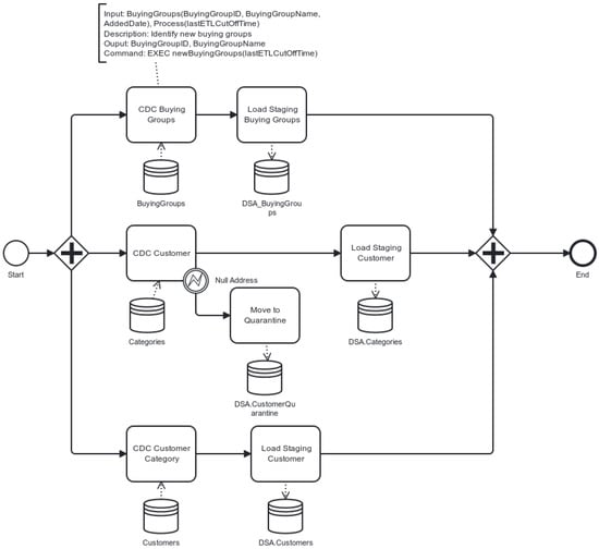 Figure 4 presents an example from [22], and maps the data flow from the source systems to the staging area, focusing on the change data capture (CDC) mechanisms. Database objects are explicitly represented as BPMN data stores, distinguishing between source systems, with directional associations clarifying input–output relationships. This aligns with BPMN’s emphasis on visual clarity, ensuring stakeholders can trace data lineage and dependencies at a glance. A BPMN intermediate compensation event is incorporated, modeled as a boundary event attached to the activity. This event triggers when specific error conditions are met, moving affected records to a quarantine table. This practice adheres to BPMN’s standards for exception handling, enabling workflows to maintain continuity while isolating faulty data for later resolution. The quarantine process itself is documented through BPMN text annotations using the same approach as in [15]. As referred to before, this practice transforms BPMN from a purely conceptual tool into a bridge for technical execution, offering implementers precise directives while retaining the model’s readability for non-technical stakeholders.