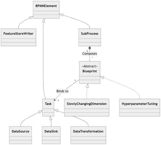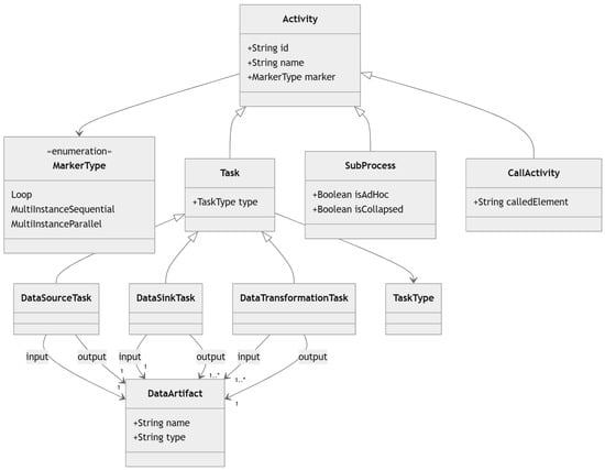 Figure 8 presents a class diagram modeling the core components. At the conceptual level, BPMNElement serves as the abstract base for the task and subprocess classes, with three specialized task types shown: DataSource (entry points), DataSink (termination points), and DataTransformation (processing units). These correspond to the fundamental building blocks of data pipelines while remaining platform-neutral.