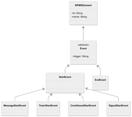 The class diagram from Figure 6 provides a formal representation of the event elements allowed in the conceptual BPMN metamodel for ETL processes. At the core, all event elements inherit from the abstract event class, which in turn extends the base BPMNElement, representing any BPMN modeling component. To improve model expressiveness and clarity at the conceptual level, triggers are each represented as specific subclasses—namely, MessageStartEvent, TimerStartEvent, ConditionalStartEvent, and SignalStartEvent. Each of these can be used to indicate different initiation mechanisms of data workflows, such as scheduled jobs (timer), external system notifications (message), conditional dependencies (conditional), or asynchronous signals (signal).