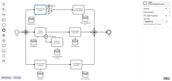- Oliveira, B.; Oliveira, O.; Belo, O. Using BPMN for ETL Conceptual Modelling: A Case Study. In Proceedings of the 10th International Conference on Data Science, Technology and Applications (Data), Online, 6–8 July 2021; Aalst, V.D., Ed.; SciTePress: Setúbal, Portugal, 2021; pp. 267–274. [Google Scholar] [CrossRef]