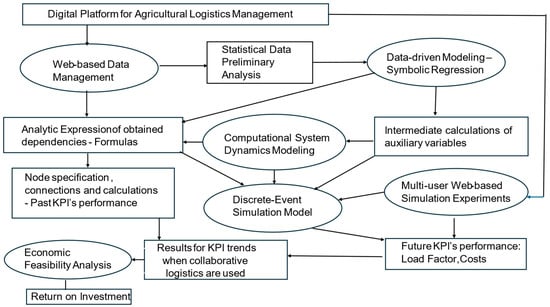 This study proposes a novel research methodology for data-driven modeling and simulation in transportation management through cross-sector collaboration among small businesses. It is built on a well-known simulation-based approach to logistics and supply chain management []. In our study, it is enhanced by integrating data-driven modeling [] and web-based simulation technologies. In particular, extracting useful information and finding dependencies in datasets, as well as transforming them into modeling formalisms, provide the basis for further simulation experiments. Therefore, the simulation is dependent on and driven by the actual behavior of the system.