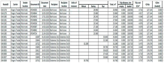 Web-based data management. The required data were obtained using a digital web platform for agricultural logistics management []. The web platform allows for the collection and storage of business data of individual small businesses and operational data on completed trips. Moreover, it provides data management for the overall control of transportation logistics and improved cost efficiency. An example of statistical data on the transportation of agricultural products obtained from the digital management platform is presented in Figure 2. In particular, the data records in the table include loading and delivery data, total length of the route, types and volumes of transported products, time of contact between the dispatcher and driver, overtime work, data on the driver and vehicle, and fuel consumption.