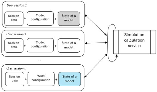 To enable multiple users to independently conduct experiments online, it was proposed [] to split the simulation model application into front-end and back-end system components. The front-end component is designed to provide the user with web access to the model, data entry, visualizations, and process diagrams. The back-end component is designed to work with the simulation model, store user data and modeling results, and process the corresponding system behavior. The multi-user approach in the back-end component is organized by storing the model configuration for each user in a separate session. The simulation model updates these sessions in a loop (see Figure 3). The software is developed using the general-purpose PHP 7.4 scripting language for Windows web development.