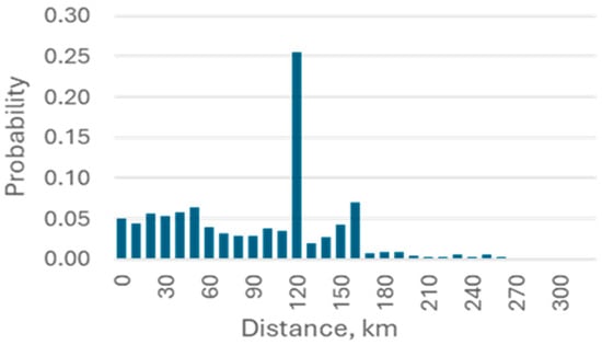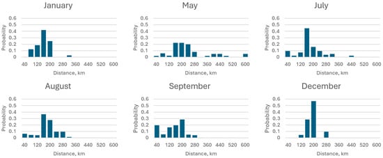 A preliminary analysis of the transportation of agricultural products revealed that the demand for transportation in the agricultural sector largely depends on seasonal factors. The probability distributions of the delivery distances of agricultural products are shown in Figure 6. The likelihood of short or nearly identical trips is higher during peak seasons, while the spread of distances is higher during off-peak seasons. This may be due to the more sporadic and irregular nature of these trips. A histogram of the delivery distances for timber transportation in different months is presented in Figure 7.