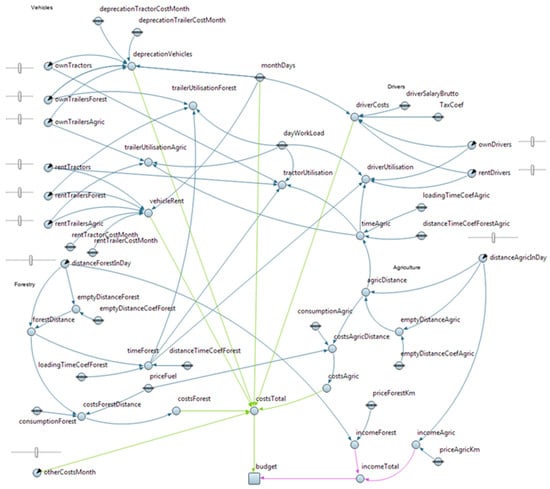 The node connection logic and node calculations are based on assumptions derived from the results of symbolic regression analysis as well as from business process analysis. The dependencies and relationships between variables (e.g., the relationship between empty and loaded route distances) that can be derived from data-driven models are substantiated through data analysis. The relationships that could not be identified in this way are determined in the model on the basis of an analysis of the cost and income structure of the analyzed enterprise.
