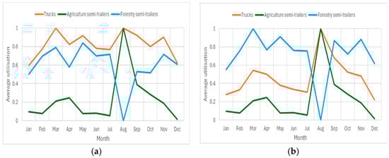 The results of the monthly stochastic simulation for the baseline and cooperative scenarios for the agricultural company are presented in Figure 11. In particular, the figure presents the results for the cases with one and three drivers (and trucks, respectively) and different configurations of agricultural and forestry semi-trailers simulated over the year. Figure 11a shows the results of the simulation experiments for the case of one driver, one truck, one agricultural trailer, and one forestry trailer. Figure 11b shows the results for three drivers, three trucks, three agricultural trailers, and one forestry trailer. In Figure 11a,b, the dark green line represents the utilization rate of agricultural trailers, the light blue line represents the utilization rate of forestry trailers, and the brown line represents the utilization rate of trucks (and drivers). Note that in the baseline scenario, where the company is only engaged in the transportation of agricultural products and does not have a specialized semi-trailer for transporting timber, the loading of trucks and drivers will correspond to the dark green lines. Thus, the difference between the brown and dark green lines illustrates the possibility of transporting timber cargo in the off-season and its impact on increasing the resource utilization rate.