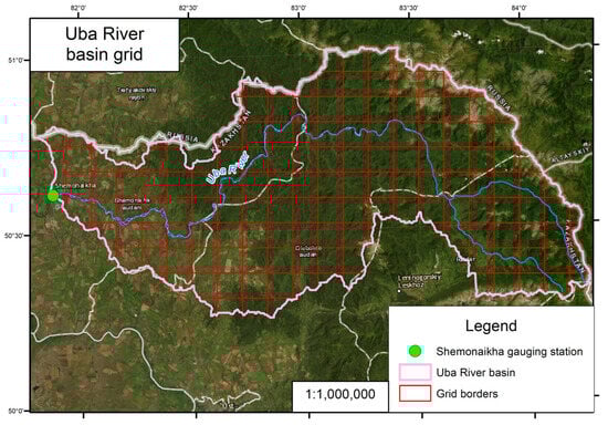 Grid map of the Uba River basin, divided into 8 km × 8 km cells.