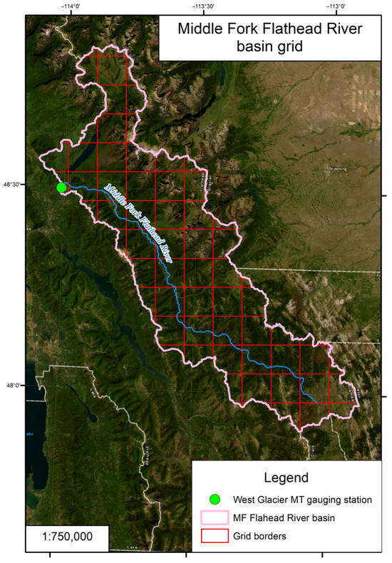 The Middle Fork Flathead River is formed by the confluence of two small streams, Strawberry Creek and Bowl Creek, in the Rocky Mountains of the northern United States. It flows through the state of Montana, and together with the North Fork Flathead River forms the Flathead River, which in turn flows into the Clark Fork River and then into the Pend Oreille River, a part of the Columbia River watershed. According to USGS reference data, its total length is 148 km and the drainage basin area is approximately 3004 km2. For the purposes of this study, the basin area is limited by the West Glacier MT hydrological gauge station and is about 2917 km2.