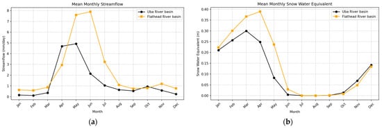 Mean monthly values of Uba River basin and Flathead River basin for: (a) streamflow; (b) snow water equivalent.