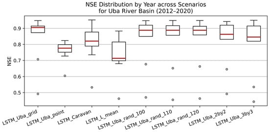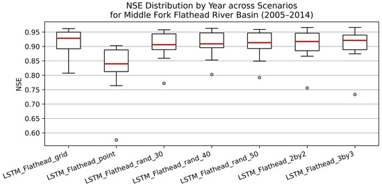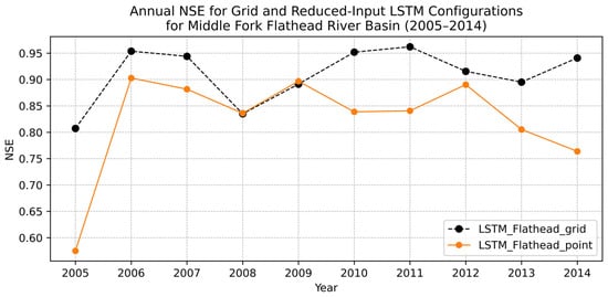 - The LSTM full-grid model employing the entire 8 × 8 km ERA5-Land grid over each basin outperforms all configurations consistently. It produces the highest median NSE of 0.905 for Uba, 0.93 for Middle Fork Flathead, and the most stable year-to-year predictions.