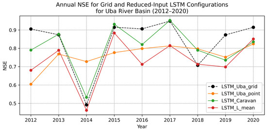 In conclusion, the experiments show that even when decreasing the number of cells (K = 100, 110, 120 of 166), the model systematically loses ≈ 1% of NSE and becomes less stable, and when reducing to 100 cells, the losses increase to ≈ 1.3% and the variation among runs becomes noticeably wider. Adding the first ten cells (K = 100 to 110) really increases stability and partially reduces the deficit; however, even at K = 120, the average performance remains below the LSTM-Uba-grid and the negative deviation reaches its maximum in the years of 2014 and 2018. Consequently, neglecting any part of the basin impairs both the average accuracy and the reliability of the model. The largest negative deviations still occur in two specific years, 2014, when the data set is distorted, and 2018, which differs markedly from the other seasons, showing that partial coverage makes the model especially vulnerable to problematic or atypical years. Full spatial coverage therefore remains essential for consistently high performance.