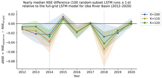 Annual median NSE differences between the subset models (K = 100 in blue, 110 in orange, 120 in green; solid lines) and the full-grid model (LSTM-Uba-grid) for the Uba River basin (2012–2020). The fill reflects the range ±1 σ for 100 runs.