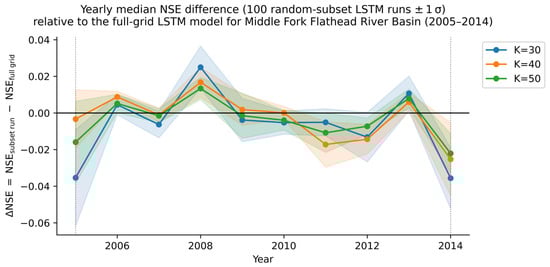 Annual median NSE differences between the subset models (K = 30 in blue, 40 in orange, 50 in green; solid lines) and the full-grid model (LSTM-Flathead-grid) for the Middle Fork Flathead River basin (2005–2014). The fill reflects the range ±1 σ for 100 runs.