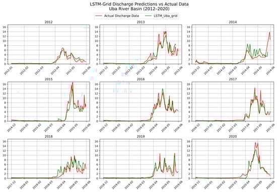 Comparison of observed discharge data (green) and LSTM-Uba-grid model predictions (red) for the Uba River basin across 2012–2020.
