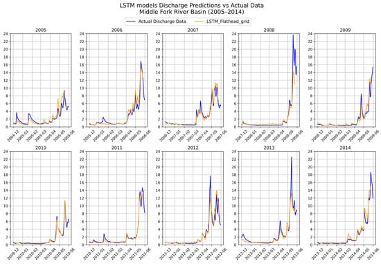 Comparison of observed discharge data (blue) and LSTM-Flathead-grid model predictions (orange) for the Middle Fork Flathead River basin across 2005–2014.