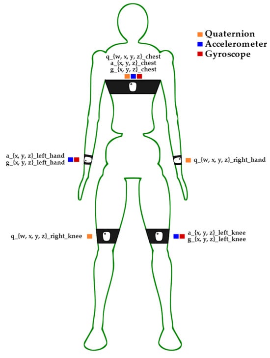 Table 2 summarizes the sensing modalities recorded at each sensor location. A selective configuration was intentionally adopted to balance data richness with transmission stability, sensor battery life, and reduced redundancy. For example, quaternion orientation was prioritized at locations where rotational dynamics are more informative (e.g., chest, left hand, right knee). At the same time, accelerometer and gyroscope data were recorded primarily from locations with significant linear and angular motion (e.g., chest, right hand, left knee).