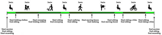 Timeline of the data collection protocol for each recording session. Participants began in a seated position and transitioned through a sequence of predefined activities, including folding clothes, sweeping, walking, moving boxes, and riding a stationary bicycle. Each activity was interleaved with seated rest periods, and the duration of each activity segment was fixed and supervised to ensure consistency across subjects.