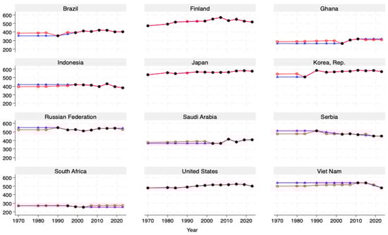 The selected countries span a broad range of geographic regions and development stages—from high-performing East Asian economies, such as Japan and the Republic of Korea, which consistently maintain average scores above 500, to lower-performing countries, such as Ghana and South Africa, which start from a lower baseline. The figure highlights diverse national trajectories: Japan demonstrates consistently high performance, while Brazil shows gradual improvement beginning in the 1990s. In contrast, countries such as Indonesia and Finland displayed declining trends in recent years. The interpolated and machine learning estimates align closely for most countries; however, discrepancies emerge in a few cases—notably in Ghana and Serbia—where early year extrapolations differ between the two approaches.