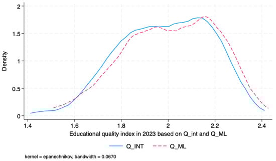Figure 2 presents the distribution of the educational quality index for the working-age population across 101 countries in 2023, comparing the estimates derived from the interpolation and machine learning approaches. Both methods yield broadly similar distributions, each exhibiting a roughly symmetric shape centered around a value close to 2.0.