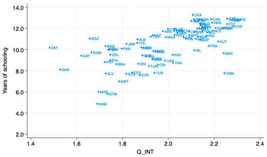 Figure 3 plots educational quality, measured by the Q interpolation index, against educational quantity, represented by the average years of schooling among adults aged 25–64, based on Barro and Lee [12], for the year 2015. The scatterplot reveals a generally positive relationship between the two measures (correlation = 0.67), indicating that countries with higher educational quality also tend to exhibit longer average durations of schooling.