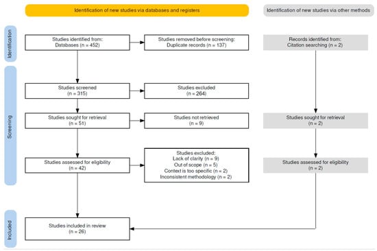 After retrieval, the studies were further assessed for eligibility with full paper reading and excluded for (a) being out of scope, when the study did not support in answering the research questions (e.g., [35]); (b) lack of clarity, when the barriers are not clearly defined (e.g., [36]); (c) being excessively circumstantial, when the barriers were context-specific and could not be generalized (e.g., [37]); and (d) having inconsistent methodology. The data collection process involved gathering the barriers from each of the studies included in the review in a single list, marking each of the studies that mentioned them. This list is presented in the Results section.