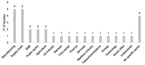 Figure 2 details the number of articles by research context. It is possible to notice a wide range of industries and sectors that were studied, with some focal points in manufacturing and supply chains.