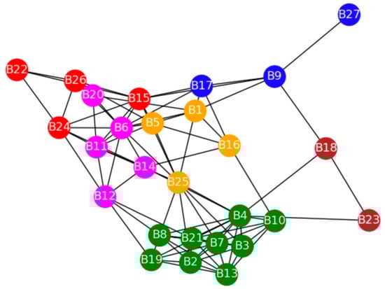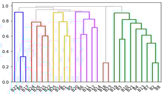 For the categorization of the barriers, this study used hierarchical clustering with the average linkage method, which is one of the most used in clustering and tends to generate better results [41]. This method considers not only the relationships between vertices, but also the strength of those relationships—or, more accurately, the lack thereof—and is therefore suitable for this study. If a barrier–barrier pair was categorized in the same group, this means that there is a relationship between these barriers. The higher the number of common groups two barriers have with each other, the greater the strength of the relationship.