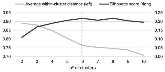 The number of clusters was determined using a combination of the elbow method and the silhouette score. The elbow method uses the average within-cluster distance to look for an elbow, that is, the point at which a further increase in the number of clusters has a diminishing decrease in the average distance. The silhouette score compares between dissimilarity to within dissimilarity and is a normalized value between −1 and 1. The number of clusters chosen should maximize the silhouette score [45]. Looking at Figure 4, the elbow is formed at six clusters, and the silhouette is maximized at six and eight clusters. Therefore, six was the chosen number of clusters; that is, within the range for the studies (between two and eight clusters). The clustering can be seen in the dendrogram in Figure 5.